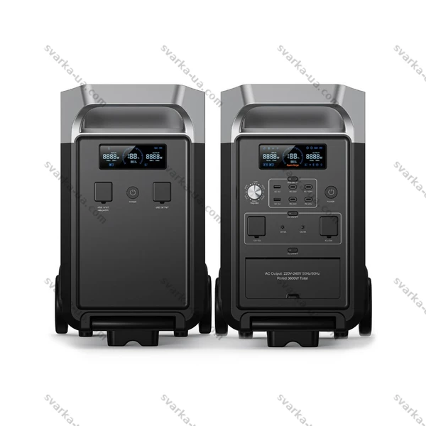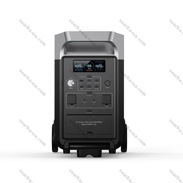 Розетка змінного струму: 3 x 220 В, чистий синусоїдний сигнал, номінальна потужність 3600 Вт (пікова потужність 7200 Вт) USB-C: 3 порти x 20 Вт (PD), 1 порт x 100 Вт (PD) USB-A: 2 порти x 18 Вт (QC3.0) Автомобільна розетка: 1 x 12 В/10 А Розетка для автодому (XT-60): 1 x 12 В/25 А DC5521 (5,5 мм): 2 порти x 12 В/3 А